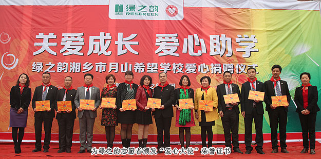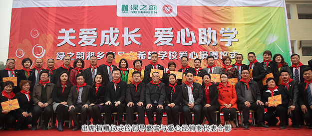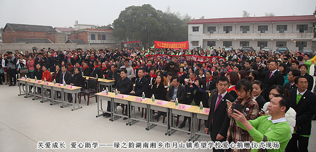 2014年3月19日,由共青團長沙市委、長沙市青基會牽頭,綠之韻集團出資30萬元建設的第九所希望學?!熬G之韻湘鄉(xiāng)市月山鎮(zhèn)希望學校”在湖南湘鄉(xiāng)市揭牌成立。共青團湘潭市委書記白云峰、共青團長沙市委副書記詹萍萍、湘鄉(xiāng)市人大常委會黨組副書記、副主任王建湘、長沙市青基會理事長羊舒麟、月山鎮(zhèn)常務副鎮(zhèn)長徐慧湘等十幾位領導嘉賓出席,綠之韻集團董事長胡國安、全球營銷中心(中國區(qū))副總經(jīng)理劉維利、湖南分公司經(jīng)理張薇與200多位綠之韻愛心經(jīng)銷商共同為愛傳承,為孩子們送上如春天般的融融暖意。