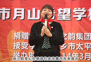 而孩子們也用他們的熱忱回饋著綠之韻的關愛,給所有捐贈愛心款項的經(jīng)銷商帶上了鮮艷的紅領巾,并認真地表演了排練近一個月的《感恩的心》和詩歌朗誦兩個節(jié)目?!案兄x幫助過我們的人,感謝關心過我們的人,是你們讓我們茁壯成長,成為學會感恩、熱愛生活的人,我將來也會像叔叔、阿姨們一樣,無私地幫助那些有困難的人。”捐贈儀式上,學生楊楊代表所有受捐學生講話。