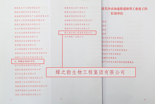 綠之韻集團(tuán)再次被長(zhǎng)沙市人民政府授予“利稅過(guò)5000萬(wàn)元企業(yè)”榮譽(yù)稱(chēng)號(hào)