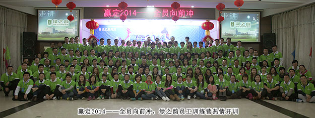 在這個(gè)節(jié)日氣氛尚未褪盡的初春時(shí)節(jié),為增強(qiáng)員工的團(tuán)隊(duì)凝聚力,提高主動(dòng)配合意識(shí)和協(xié)同能力,促使大家勇于挑戰(zhàn)自我,挖掘潛力,分秒必爭(zhēng),達(dá)成目標(biāo),進(jìn)一步積極、全面和深入地弘揚(yáng)“厚德載物、目標(biāo)堅(jiān)定、有容乃大、低調(diào)實(shí)干、勇往直前、厚積薄發(fā)、團(tuán)隊(duì)制勝、堅(jiān)持到底、整合資源、改變自我”的綠之韻“水文化”,綠之韻集團(tuán)組織全體員工進(jìn)行了為期三天兩晚的“贏定2014——全員向前沖”訓(xùn)練營(yíng)活動(dòng)。