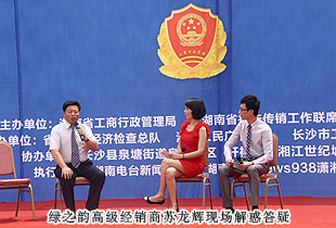 湖南省打擊傳銷工作聯(lián)席會議辦公室主任、湖南省工商局副局長魯先華,湖南省打擊傳銷工作聯(lián)席會議辦公室副主任、湖南省經(jīng)濟檢查總隊總隊長毛愛倫,湖南省經(jīng)濟檢查總隊副總隊長肖向陽,長沙市工商局黨組書記、局長卓精華,長沙市工商局黨組副書記、副局長潘虹,長沙縣人民政府副縣長、公安局長曾衛(wèi)國,長沙縣工商局黨組書記、局長舒曲等領(lǐng)導和嘉賓蒞臨活動現(xiàn)場指導。綠之韻集團受邀參與此次活動,湖南分公司代表、高級經(jīng)銷商蘇龍輝先后與主持人、居民朋友進行一問一答式互動,贏得了現(xiàn)場陣陣熱烈的掌聲。