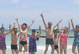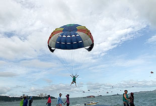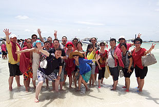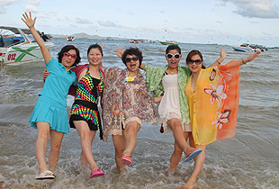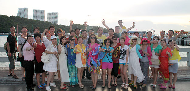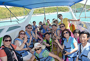 白天的芭堤雅度假區(qū)的沙灘上有各種各樣的水上活動,因為終年陽光普照,溫暖的海水在陽光閃爍璀璨,所以各項水上活動應有盡有。小型帆船、滑浪風帆、滑水、淺水潛游、深水潛泳、深海釣魚等等,不但一切器材及時供應,并且還有專業(yè)的教練手把手教你。如果嫌在海灘的活動仍未能盡興,還可以乘船出海,前往各個海島。此次綠之韻浪漫泰國之旅,綠之韻的精英們在三個不同的島嶼之間穿梭,感受到了這個有著“東方夏威夷”美譽的地方,確實有著非同凡響的熱度和美麗。一望無際、清澈的散發(fā)著寶石藍光芒的海,岸邊的椰樹搖曳,棟棟西洋、泰式建筑掩映其間——我們讓微微帶咸的海風柔柔的撫摩著臉,海水輕輕地、輕輕地沖上沙灘上又退去??粗矍安┐蟮暮?、聽著悅耳的濤聲,大家無不贊嘆這個熱帶風情十足、令人流連忘返的地方。